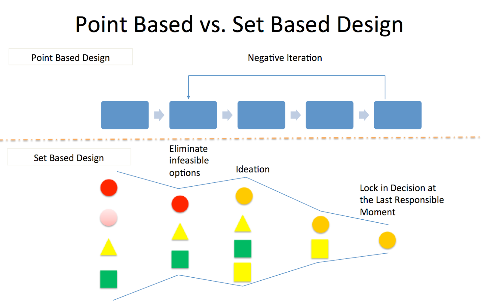If you only explore one idea (called point based design), there is less chance for learning. Then when new information arises, you have to start all over again – maybe even go back to the start. With set based design, learning is gained earlier and may require stepping back one space vs. going all the way back to the beginning.