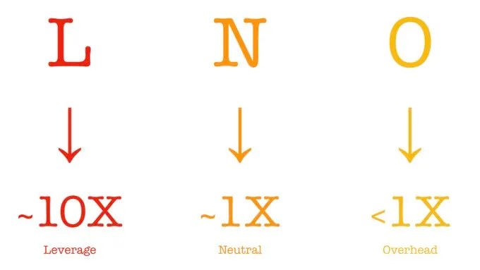 Leverage (L) tasks are the ones to identify and focus on as they 10x your impact. Neutral (N) tasks are those where you get the expected impact given the time commitment. Overhead (O) tasks have very little impact given the time required.
