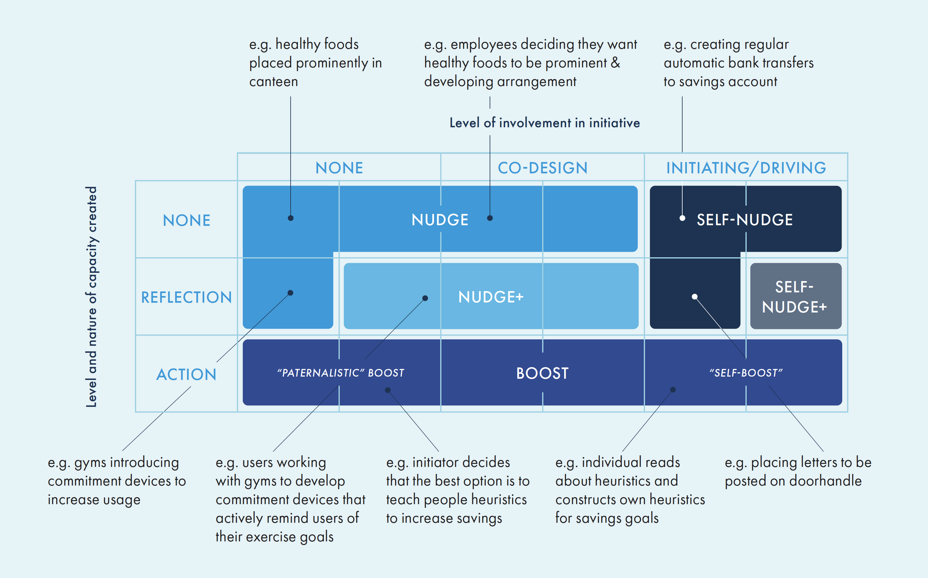 How far a person performing the behavior is involved in shaping the initiative itself. They could not be involved at all, involved in co-designing the intervention, or initiating and driving the intervention itself.