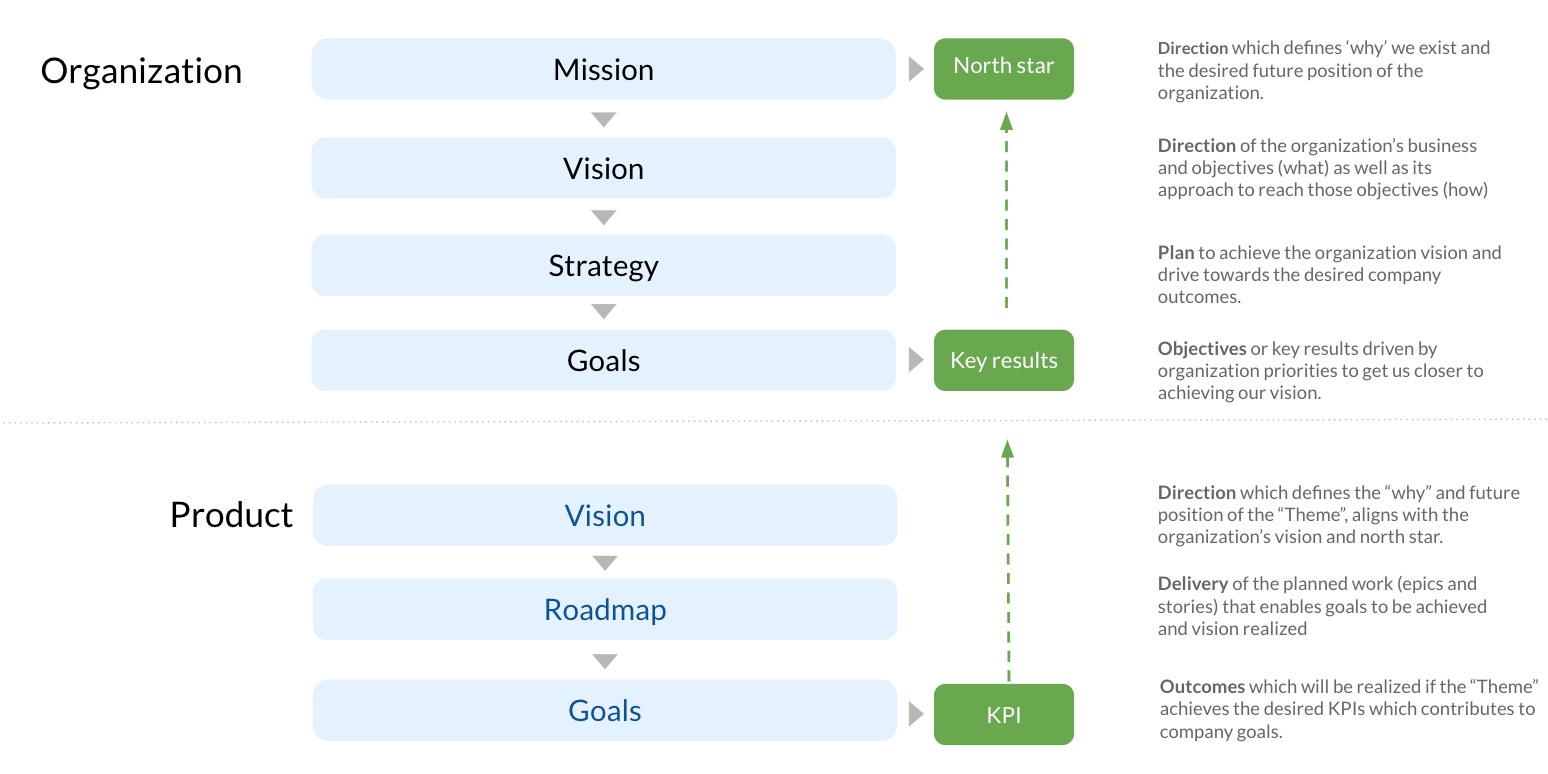 At the tippy top of the strategy stack are the company (organization) elements – Mission, Vision, North Star, and Goals.