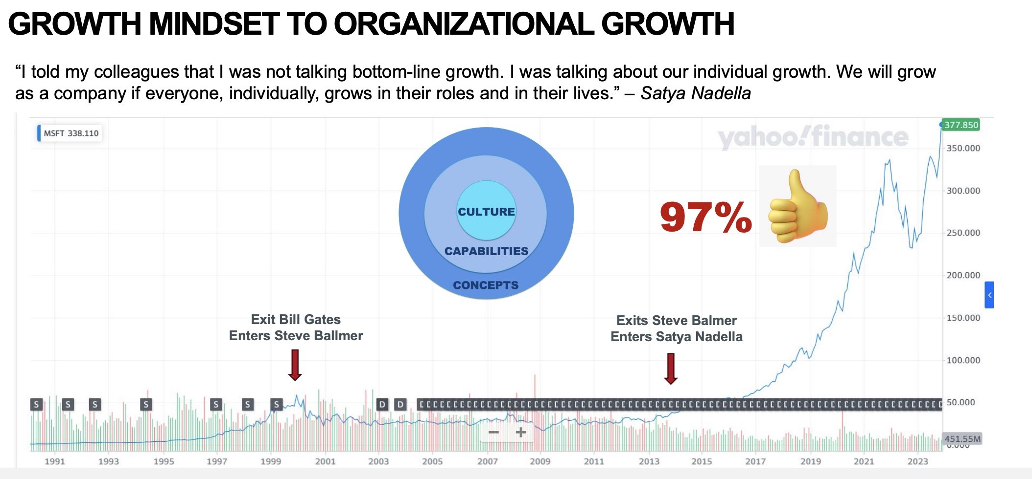 With the rise of AI, growth-minded organizations are shifting from valuing those who simply ‘know it all’ to those who can ‘learn it all’. Microsoft’s CEO Satya Nadella is the reference which often comes to mind. His focus on favoring a growth mindset is noted as one of the factors leading to the company’s continued growth.
