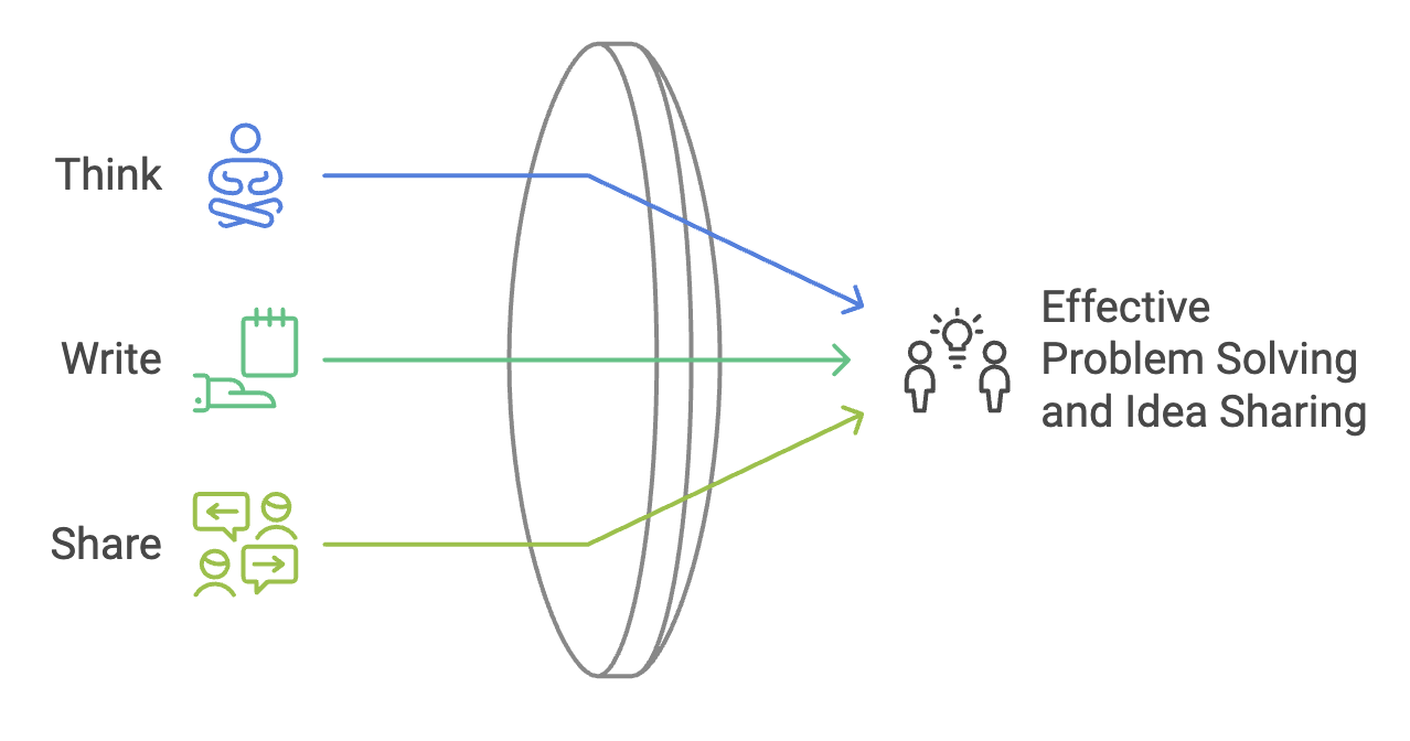 Everyone first thinks about a problem or question silently for 60 seconds. Only after this quiet time do people write down their ideas. Sharing happens last, ensuring both introverts and extroverts contribute equally.